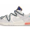 The Nike Off-White Lot 28 features a white leather base , coupled with gray leather inserts. There are several purple accents on the zip tye, laces and tongue. The 28 of 50 and the NIKE branding on the heel complete the look.